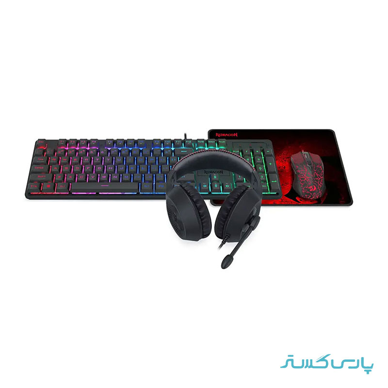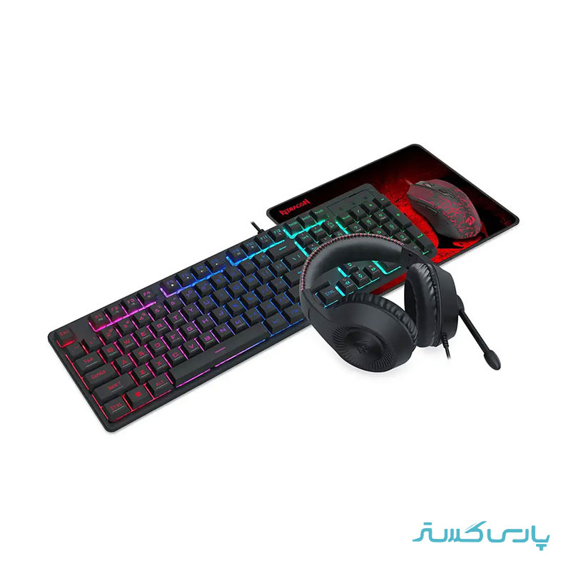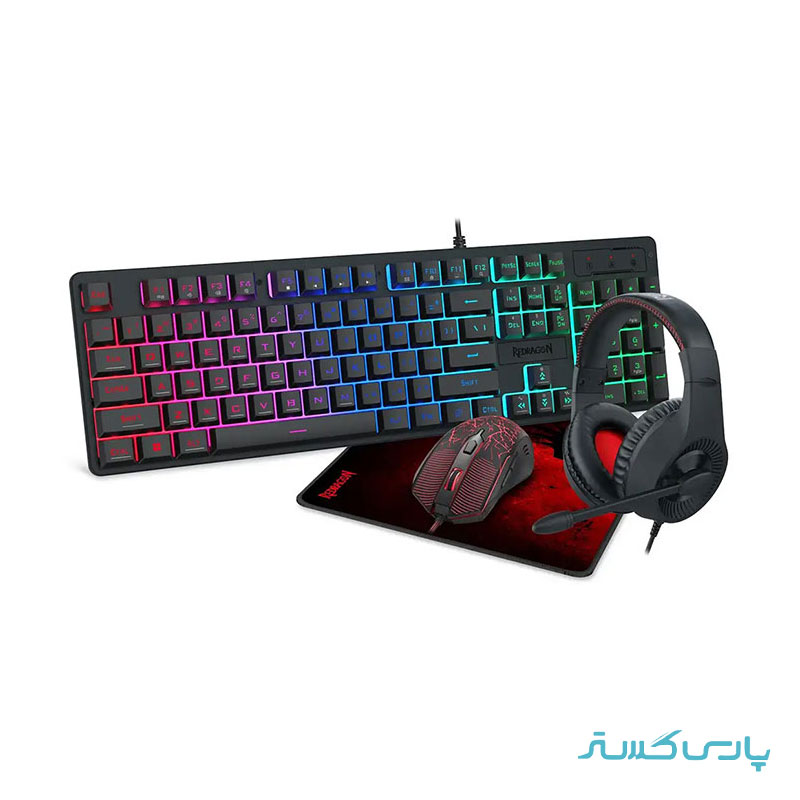 باندل گیمینگ هدست و کیبورد و ماوس و ماوس پد ردراگون مدل Redragon S107P BA؛ رنگ مشکی، گارانتی تخت جمشید. مشخصات کلیدی: کیبورد با سیم با 104 کلید، نورپردازی دارد، کلیدهای نام-پد دارد، ابعاد کیبورد 31×128×434 میلیمتر، وزن 581 گرم، نوع اتصال باسیم، نوع رابط پورت USB؛ ماوس با 6 کلید، شتاب 10G، حداکثر دقت حسگر 800/1600/2400/3200 DPI، نورپردازی دارد، نوع رابط USB، نوع اتصال باسیم، موس قابل استفاده با دست راست، ابعاد 40×66×127 میلیمتر، وزن 432 گرم، نرخ نمونهبرداری 500 هرتز؛ هدست با سیم، نوع اتصال باسیم، رابط جک 3.5 میلیمتر، قطر درایور 40 میلیمتر، ابعاد 10×180×280 میلیمتر، وزن 235 گرم؛ ماوس پد از جنس پارچهای نرم، ابعاد 3×260×330 میلیمتر، وزن 160 گرم مباشد